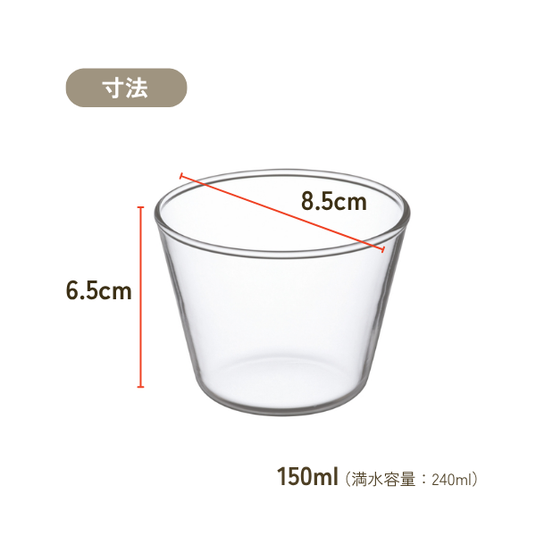 JANコード 4905284090104 素材 耐熱ガラス 寸法 φ8.6×H6.5cm 原産国 タイ 容量 150ml(実用容量) / 240ml(満水容量) カテゴリー クックウェア >> プリンカップ 取り扱いについての注意 耐熱ガラスは熱に強いガラスであり、衝撃に強い強化ガラスとは異なりますので、丁寧にお取扱いください。 詳細はこちら