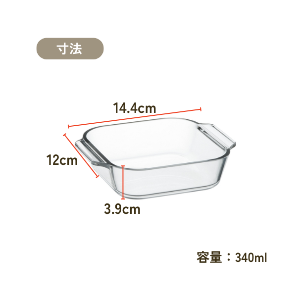 JANコード 4905284143848 素材 耐熱ガラス 寸法 W14.4×D12×H3.9cm 原産国 中国 表示容量 満水容量 カテゴリー クックウェア >> ケーキ・オーブン皿 取り扱いについての注意 耐熱ガラスは熱に強いガラスであり、衝撃に強い強化ガラスとは異なりますので、丁寧にお取扱いください。 詳細はこちら