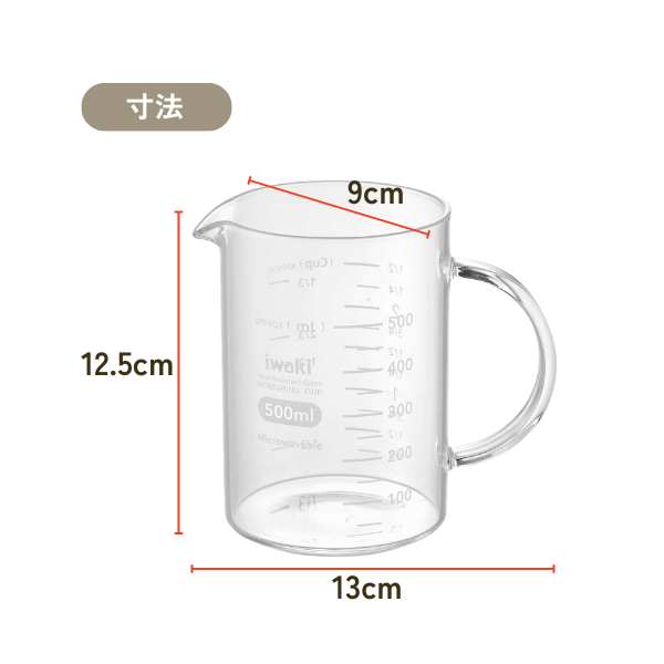 JANコード 4905284174439 素材 耐熱ガラス 寸法 W13×D9×H12.5cm 原産国 中国 表示容量 実用容量 カテゴリー クックウェア >> メジャーカップ 取り扱いについての注意 耐熱ガラスは熱に強いガラスであり、衝撃に強い強化ガラスとは異なりますので、丁寧にお取扱いください。 詳細はこちら