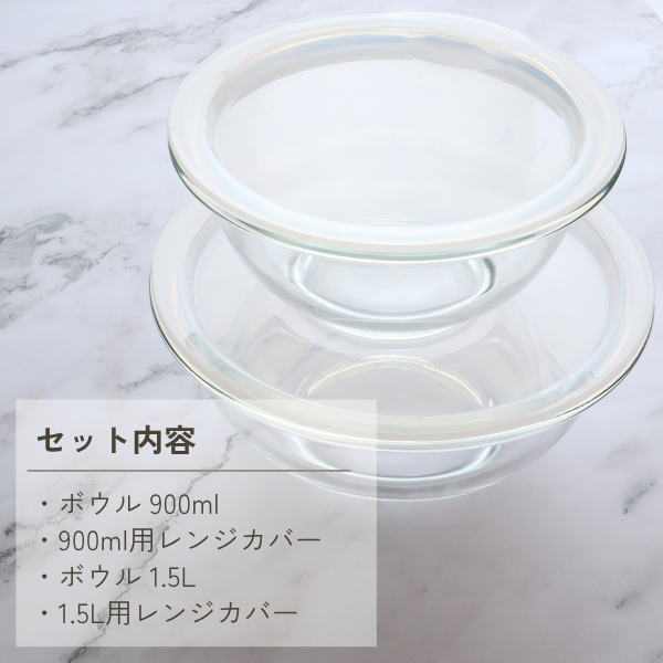 【ボウル】 900ml/φ18×H8cm ×1個 1.5L/φ21.3×H9cm ×1個 【ボウルレンジカバー】 ボウル900ml用/W18.4×D18cm ×1個 ボウル1.5L用/W21.8×D21.5cm ×1個 |