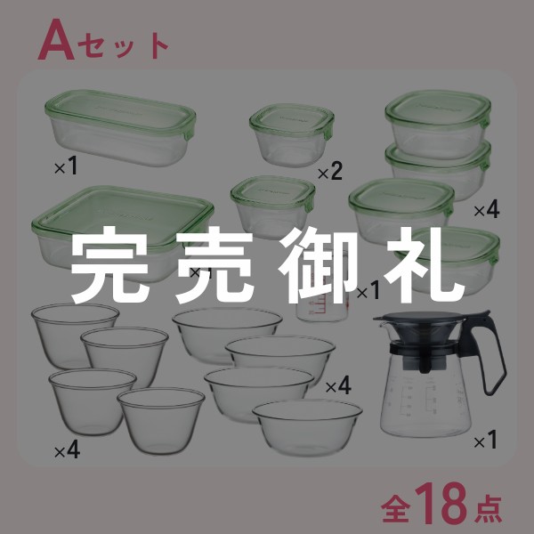 Aセットはiwakiの耐熱ガラスが18点入ってます!