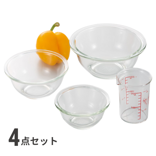 ボウル 250ml/φ11.6×H5.8cm ×1個 500ml/φ14.4×H6.8cm ×1個 900ml/φ18×H8cm ×1個 メジャーカップ 200ml/φ7.4×H10cm ×1個 |