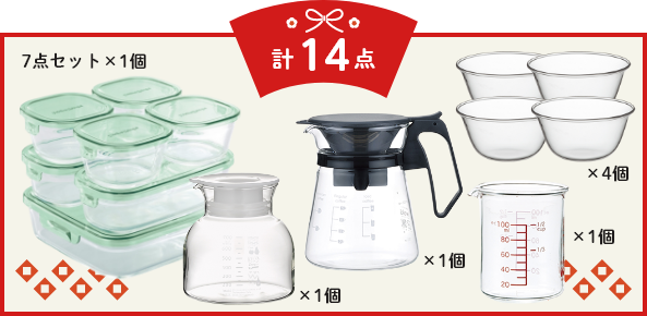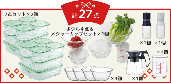 スイーツカップ(ヨーグルト)×4個/メジャーカップ100ml×1個/ごまミル ホワイト×1個/岩塩・スパイスミル×1個/NEWコーヒーハウス ブラック×1個/パック&レンジ 7点セット グリーン×2個/ボウル4点&メジャーカップセット×1個
