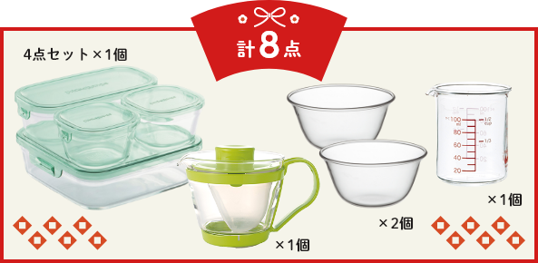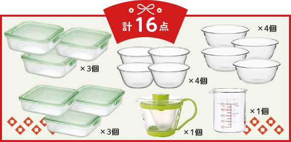 スイーツカップ(ヨーグルト)×4個/スイーツカップ(フルーツ)×4個/メジャーカップ100ml×1個/レンジのポット・茶器×1個/パック&レンジ (グリーン)800ml×3個/パック&レンジ(グリーン)1.2L×3個