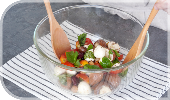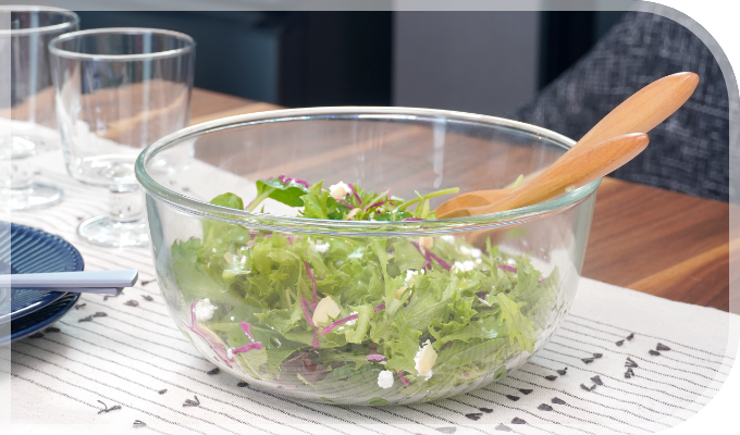 厚手のガラス製のため、片手で軽々持つことは難しいですが、両手でしっかり持っていただくと安心してご使用いただけます。食材を混ぜたり、サラダスピナーとして使う際も安定感があり、使いやすいボウルです。