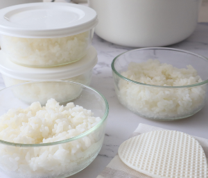 ごはんは水分を多く含むため、大きめの容器を使用し、フタをして上下左右に振って十分に空間を作ってから冷凍してください。