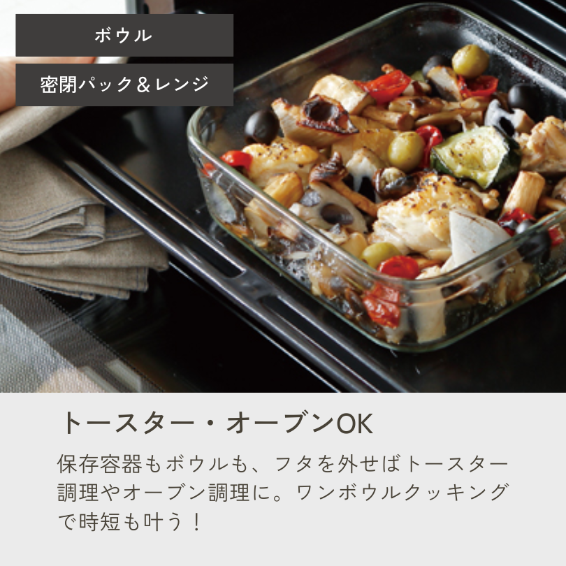 | 素材 | 【共通】ボウル、保存容器本体/耐熱ガラス 【ボウルレンジカバー】 ポリプロピレン(耐熱温度:140℃) 【密閉パック&レンジ】 フタ/ポリブチレンテレフタレート(耐熱温度:140℃) バルブ/シリコーンゴム(耐熱温度:200℃) |