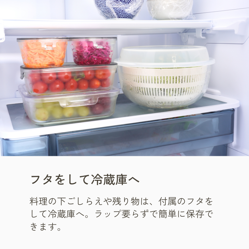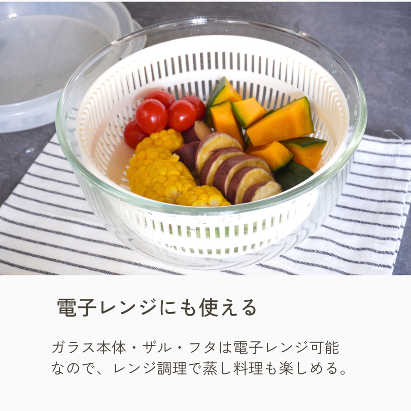 素材 | ボウル/耐熱ガラス レンジカバー/ポリプロピレン(耐熱温度:140℃) スピナーカバー/ポリプロピレン(耐熱温度:120℃) エラストマー(ハンドル部)(耐熱温度:100℃) 回転板/ポリプロピレン(耐熱温度:120℃) バスケット/ポリプロピレン(耐熱温度:140℃) 回転軸/ポリプロピレン(耐熱温度:120℃) |
