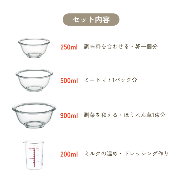 ボウル 250ml/φ11.6×H5.8cm ×1個 500ml/φ14.4×H6.8cm ×1個 900ml/φ18×H8cm ×1個 メジャーカップ 200ml/φ7.4×H10cm ×1個 |